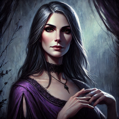 - Long greying black hair usually tied back in some way to display the Haltija symbol on her neck. She is always dressed in fine gowns and has a stern expression on her face. When she speaks, it is with purpose.