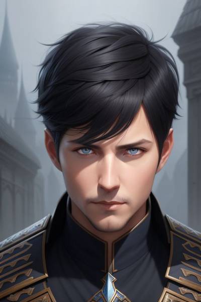 - Short, flat black hair and pale blue eyes with yellow patches of scales on his exposed skin. He walks with a sure step and speaks with a firm voice when on duty, though he does behave casually with his men and the soldiers report he has an interesting sense of humor.