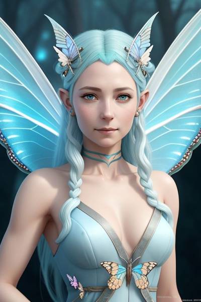 - She has blue, silver, and gold wings on her back with pointed ears. She has long, pale blue hair that hangs loosely down her back and a silver, bejeweled crown atop her head. She wears a lot of jewelry usually and has a pleasant, soft smile on her face.